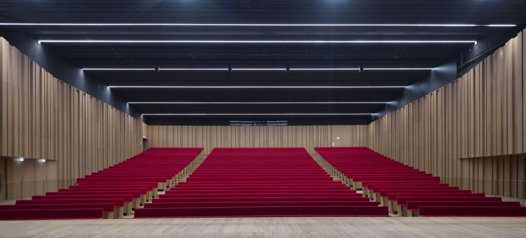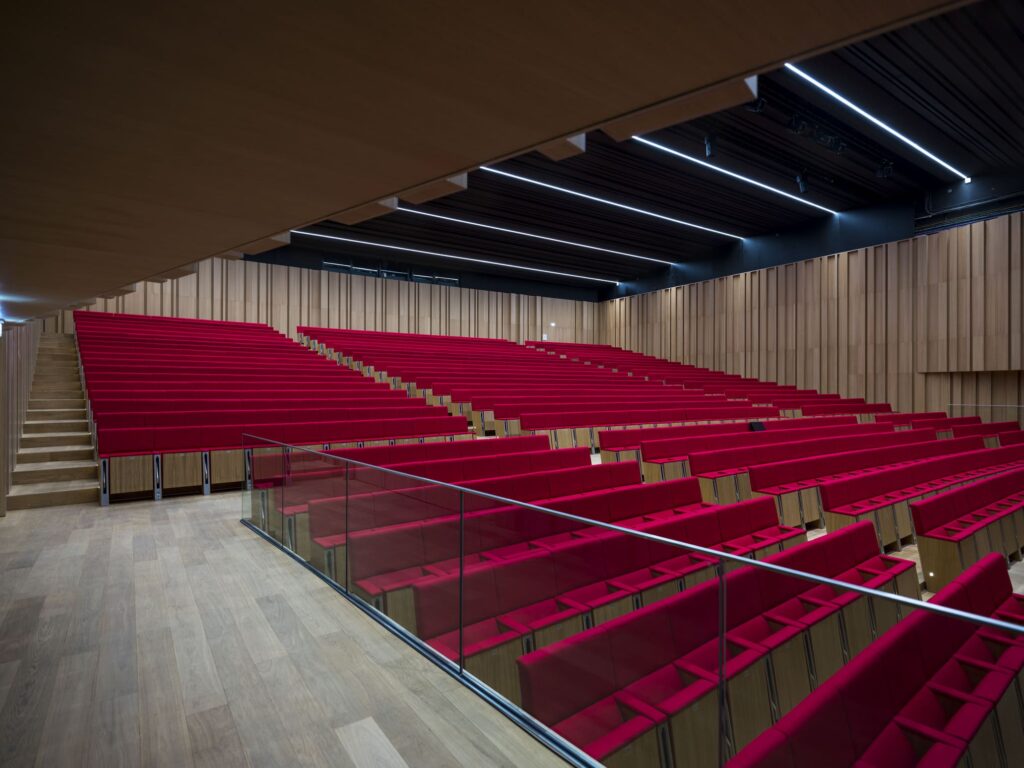 Le confort proposé est aussi l’un de grands atouts du Grand Auditorium ! Ses sièges ont été fabriqués par le même fournisseur que la célèbre salle Pleyel, à Paris. Leur habillage en chêne massif est équipé d’une tablette de prise de notes et, pour un siège sur deux, d’une prise électrique et d’une prise USB.