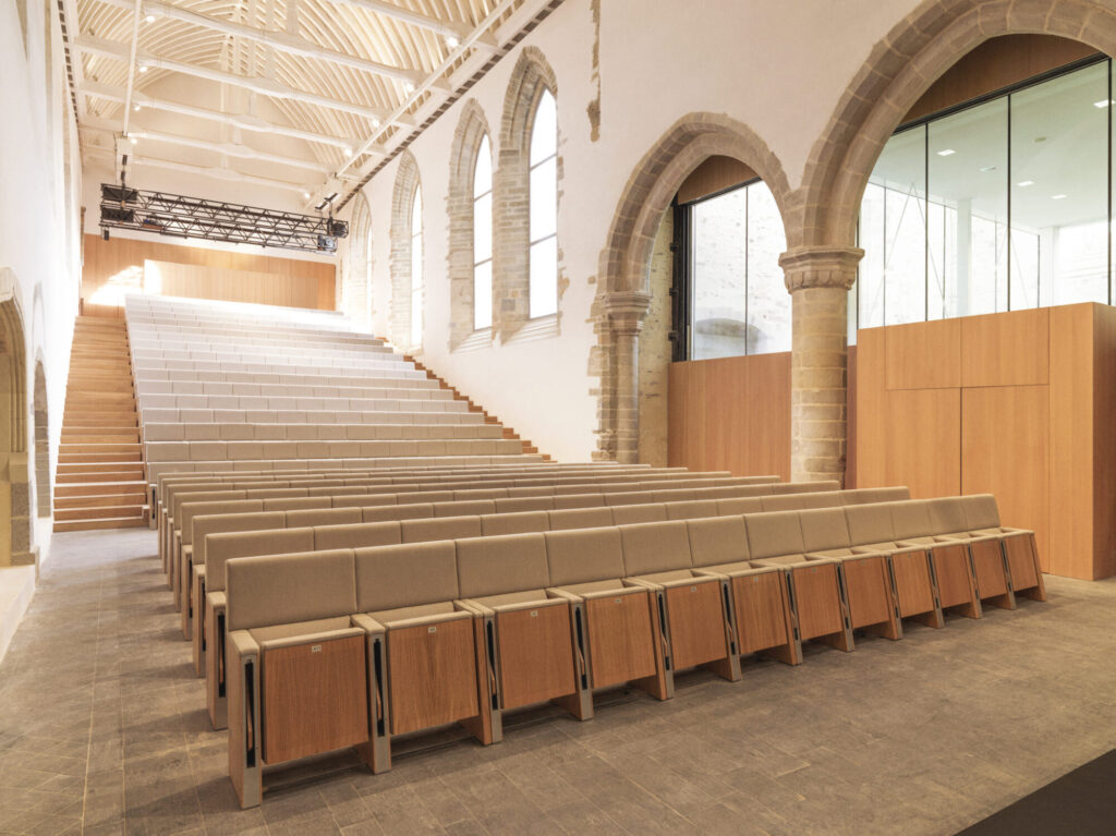 Au Couvent des Jacobins, un espace attire particulièrement l’attention : c’est la Nef. Dans cette ancienne église transformée en auditorium, l’esthétique et la lumière sont exceptionnelles. Entièrement connectée et équipée, modulable au gré des envies, la Nef abrite une œuvre de l’artiste Laurent Grasso qui joue avec la lumière extérieure et intérieure !